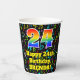 Dieses fröhliche und farbenprächtige musikalische Geburtstagszeitpapier-Cup-Design zeichnet sich durch eine große Zahl "24" mit einem inspirierten Regenbogenspektrum-Gefälle aus, zusammen mit der Meldung "Happy 24. Geburtstag" und einem individuelle Name. Der Hintergrund zeichnet sich durch ein aufregendes und farbenprächtiges Muster aus, mit Musiknoten und Symbolen verschiedener Farben und Größen. Farbenfrohe, lebendige Papiertassen wie diese können sich bei einer Geburtstagsfeier/einem Party, das zur Ehrung des 24. Geburtstages von jemandem gehalten wird, amüsieren. [~Z0000541]