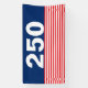 Zur Feier des 250. Geburtstags Amerikas befindet sich ein blaues Feld oben mit 250 in weißem Text. Rote und weiße Streifen sind unten, die an die amerikanische Flagge erinnern.