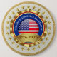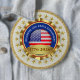 The design features a classic American flag centered within a bold royal blue ring. Encased in a brilliant gold-style sunburst and surrounded by a ring of 20 elegant gold stars, this button offers a premium, official appearance that stands out on any garment.