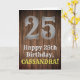 Dieses Landaussehen und Western inspiriert Geburtstag Grußkarte Design zeigt eine große rustikale inspiriert Zahl "25", die Meldung "Happy 25 th Birthday", einen anpassbaren Namen, und ein Imitat/Imitation Holz Getreide inspiriert Stil Muster Hintergrund. Die Innenseite hat eine bearbeitbare Geburtstagsgrüßnachricht, oder könnte gelöscht und leer verlassen werden, wenn eine Nachricht stattdessen von Hand geschrieben werden soll. Eine personalisierte Geburtstagskarte wie diese könnte eine lustige Art sein, jemandem, der seinen fünfundzwanzigsten Geburtstag feiert, eine Geburtstagsgrüße zu schicken. [~Z0000469]