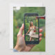 Rotwein aus einer Flasche strömt auf einem Smartphone-Bildschirm in ein Glas, während eine Frau in einer Gartenuhr sitzt und so eine faszinierende visuelle Mischung aus Digital und Realität für eine 25. Geburtstagsparty schafft. Alle Texte können geändert werden.