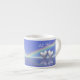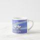 Espresso-Tasse mit meinem originalen Kunstwerk von zwei silberfarbenen Herzen, die unter einem Regenbogen auf dem Wasser schwimmen. Im Text steht "25 Jahre".