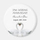 Zwei wunderschöne Schwäne in der Liebe, die ihre Köpfe zusammenbiegen und ein Herz bilden. Weiße, elegante Kulisse, perfekt für einen silbernen Hochzeitstag! Ein Schwanenpaar bleibe für das Leben zusammen, also sind sie das perfekte Symbol für Liebe. Mit dem Text: 25. Jahrestag. Vorlage für zwei Namen, schwarze Buchstaben.