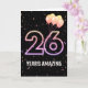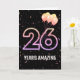 Party Ballons und Konfetti auf schwarzem Hintergrund mit dem Neon Nummer 26 für einen 26. Geburtstag.