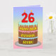 Dieses fröhliche und optimistische Geburtstagskarten-Design enthält eine Cartoon-Darstellung eines dreistufigen Geburtstagskuchens mit numeralförmigen Kerzen oben, die die Zahl "26", zusammen mit der Meldung "HAPPY 26. BIRTHDAY" und einem personalisierten Empfängernamen zeigt. Der Hintergrund der Vorderseite hat ein buntes, pastellfarbenes Regenbogenspektrum, inspiriert Farbverlauf. Die Innenseite hat eine individuelle Geburtstagsgrüßnachricht, oder könnte gelöscht und leer verlassen werden, wenn eine Nachricht von Hand geschrieben werden soll. Eine lustige, anpassbare Geburtstagskarte wie diese könnte eine lustige Art sein, eine Geburtstagsgrüßbotschaft an jemanden zu senden, der seinen sechsundzwanzigsten Geburtstag feiert. [~Z0000625]
