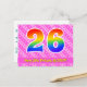 Die Vorderseite dieses lustigen, fröhlichen und fröhlichen Geburtstags-Thema Postkartendesign zeigt eine große Zahl "26" mit einem inspirierten Regenbogenverlauf, zusammen mit der Meldung "Happy 26 th Birthday" und einem bearbeitbaren Empfängernamen. Die Vorderseite ist zusätzlich mit einem fröhlichen, hellrosa und dunkelrosa gestreiften Muster mit Herzformen ausgestattet. Auf dem Rücken befindet sich eine benutzerdefinierte Geburtstagsgrüßmeldung, oder es kann sein, dass sie gelöscht und leer verlassen wird, wenn eine Nachricht von Hand geschrieben werden soll. Eine individuell gestaltbare Geburtstagskarte wie diese könnte eine lustige Art sein, jemandes sechsundzwanzigsten Geburtstag zu feiern. Postkarten wie diese können auch benutzt werden, um die Gäste zu einer Geburtstagsfeier oder einem Party für jemanden einzuladen, der 26 Jahre alt ist. [~Z0000449]