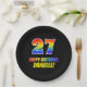Dieses farbenfrohe, lustige und fröhliche Geburtstags-Thema Papier Platte Design zeigt eine große Zahl "27" und die Nachricht "GLÜCKLICH BIRTHDAY", beide mit einem Regenbogenspektrum-Farbverlauf inspiriert, zusammen mit einem kühnen gelben editierbaren Namen. Der Hintergrund ist schwarz. Teller wie diese können bei einer Feier zur Ehrung des 27. Geburtstages von jemandem verwendet werden. [~Z0000488]