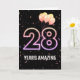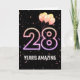 Party Ballons und Konfetti auf schwarzem Hintergrund mit dem Neon Nummer 28 für einen 28. Geburtstag.