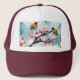Der charmante LKW-Hut mit zwei bezaubernden Hummeln, die vor einem sanften Federhimmel unter blühenden Rosa Kirschblüten fröhlich blühen. Dieses inspirierte Design erweckt das Wesen der Natur in voller Blüte, perfekt für Gartenliebhaber und diejenigen, die die Schönheit des Frühlings lieben.