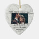Feiern Sie einen fröhlichen 1. Urlaub als Mr. und Mrs. mit einem maßgeschneiderten herzförmigen 2-Foto "Unser erstes Weihnachtsfest Verheiratet" Imitate Marmor Keramik Ornament. Alle Texte und Bilder auf dieser Vorlage sind einfach zu personalisieren. (IMAGE PLACEMENT TIP: Eine einfache Möglichkeit, ein Foto genau so zu zentrieren, wie Sie es gewollt haben, ist es, es einzuschneiden, bevor Sie es auf die Zazzle-Website hochladen.) Das Design besticht durch eine stilvolle, schwarz-weiße Imitat-Marmorleiste, Schreibmaschinentypografie, handgeschriebene Schriftzeichen-Kalligraphie, die Namen und das Jahr der beiden Pärchen und zwei Fotos Ihrer Wahl. Dieser einzigartige Ehering-Sake fügt Xmas Zuhause Dekorationen eine elegante Touch hinzu. Beispiel Foto auf der Vorderseite ist von Tim Stagge (Quelle: @tim_stagge on Unsplash).