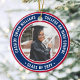 Erinnern Sie sich an den Erfolg des Absolventen mit einem patriotischen rot, weiß und blau Zoll zwei Foto rund Abschluss Weihnachtsschmuck. Bilder und Text sind einfach zu verändern und können auf Vorder- und Rückseite unterschiedlich sein. (IMAGE & TEXT DESIGN TIPS: 1) Um die Position der Formulierung anzupassen, fügen Sie Leerzeichen am Anfang oder Ende. 2) Um das Foto genau so zu zentrieren, wie Sie gewollt haben, schneiden Sie es quadratisch aus, bevor Sie es auf die Zazzle-Website hochladen.) Beinhaltet ein beliebtes inspirierendes Zitat, motivierend Sprichwort, Schulname und -abschluss, Glückwünsche, vielen Dank an Mama und Papa, oder eine andere Botschaft Ihrer Wahl. Das Design zeichnet sich durch einen eleganten Streifenrand, personalisierten modernen Typografiennamen, das Schuljahr & das Klassenzimmer in einem Kreis und 2 Fotos des Absolventen aus, wie z. B. Seniorenbilder oder Bilder aus der Anlauffeier. Macht eine nachdenkliche High School, Uni, Politikwissenschaft, Militär- oder Polizeiakademie Abschluss halten Geschenk Idee.