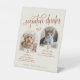 Feiern Sie Ihre zwei furry Freunde mit einem zauberhaften "Signature Drinks" Hochzeitszeichen mit ihren Fotos und personalisierten Cocktails. Diese bearbeitbare Vorlage ist in einer warmen Terrakotta- und Cremepalette konzipiert und beleuchtet den Namen jedes Haustieres neben einem von ihm inspirierten Getränk. Eine sentimentale Art, Ihre Haustiere in Ihren besonderen Tag einzubeziehen. Personalisieren Sie die Vorlage mit Namen, Cocktailnamen, Zutaten und Fotos Ihres Haustieres (Bilder, die zuerst auf ein Quadrat um das Gesicht zugeschnitten wurden, funktionieren am besten). © Kimbellished, LLC