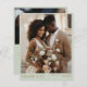 Ein schlichtes und elegantes Dankeschön-Kartendesign mit edlem, goldfarbenem Text auf einem ruhigen, blassgrünen Hintergrund. Das Layout zeigt ein großes Porträt-Foto auf der Vorderseite und ein Landschafts-Foto auf der Rückseite und schafft so einen zeitlosen und raffinierten Look. Die Rückseite bietet auch Platz für Ihre persönliche Nachricht, sodass Sie Ihre Dankbarkeit im Stil teilen können. Ideal, um den Hochzeitsgästen zu danken und Erinnerungen von Ihrem besonderen Tag an zu bewahren.