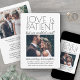 Laden Sie sich mit dieser stilvollen modernen "Liebe ist geduldig, aber wir konnten nicht warten" 2 Foto-Einladung zu einem schlicht eleganten Hochzeitsfest ein. Alle Formulierungen sind einfach zu personalisieren für jeden Empfang nur Feiern, einschließlich ein Post-Emotion-Party, Verleihfeier, Fortsetzung Hochzeit, 1. Jubiläum, Cocktail-Stunde oder Abendessen Party. Passen Sie es an, um die von Ihnen gewünschten Details wie z. B. Ehedatum, Kleidercode, uAwg, Website usw. einzubinden (IMAGE PLACEMENT TIP: Eine einfache Möglichkeit, ein Foto genau so zu zentrieren, wie Sie es gewollt haben, ist es, es einzuschneiden, bevor Sie es auf die Zazzle-Website hochladen.) Das moderne minimalistische Schwarz-Weiß-Design umfasst zwei Bilder des frisch verheirateten Paares, eine trendige handgeschriebene Schriftzeichen-Kalligraphie und eine schicke Schreibmaschinentypografie. Egal, ob Sie aufgrund der Kokospanidemie entstanden sind oder auf eine kleinere, intimere Minimonie oder Mikrohochzeit reduziert werden, das Glück nach dem Party kann immer noch beginnen. Herzlichen Glückwunsch an die Braut und Bräutigam!