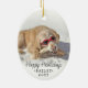 Feiern Sie die Freuden Ihres Furry Familienmitglieds mit einem maßgeschneiderten 2-Foto-Oval-Keramik-Ornament. Text- und Hundebilder auf dieser Vorlage sind einfach zu personalisieren und können auf Vorder- und Rückseite unterschiedlich oder gleich sein. Falls gewünscht, ändern Sie "Bark Humbug" und "Happy Howlidays" in "Frohe Weihnachten" oder anderen Text. Die Ornamente können auch für jedes Haustier, wie z.B. eine Katze oder ein Hamster, oder als Gedenkstätte verwendet werden. Das Design verfügt über ein Schwarz-Weiß-Overlay, eine stilvolle Schrift-Typografie, einen modernen minimalistischen Schreibstil mit Namen und Jahr sowie 2 Bilder Ihrer Wahl. Dieser einzigartige Hundefreund-Sake fügt Xmas Zuhause-Dekorationen eine elegante Touch hinzu.