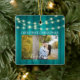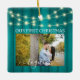 Feiern Sie den fröhlichen 1. Urlaub Ihrer Verlobung mit einem maßgeschneiderten 2 Fotos "Unser erstes Weihnachten zusammen" aquamarinen Parkettplatz Keramik Ornament. Dieses Design zeichnet sich durch einen stilvollen, aquamarinen Holzkornhintergrund mit Weihnachtslicht, handgeschriebener Stilkalligraphie, den Namen und das Jahr der Paare und zwei Fotos Ihrer Wahl aus. Dieser einzigartige Ehering-Sake fügt Xmas Zuhause Dekorationen eine elegante Touch hinzu.