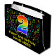 Dieses lustige, farbenfrohe und lebendige Geschenktütendesign mit Geburtstagsthema zeigt eine große Zahl "2" mit einem inspirierten Regenbogenspektrum-Gefälle, zusammen mit der Meldung "Happy 2. Geburtstag" und einem individuelle Name. Ein Teil des Hintergrundes hat farbenfrohe Musiknoten und Symbolmuster. Eine Geschenktasche wie diese kann eine lustige Art sein, ein Geburtstagsgeschenk oder ein Geschenk für jemanden zu verpacken, der seinen 2. Geburtstag feiert. [~Z0000425]
