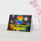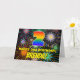 Die Vorderseite dieses fröhlichen und fröhlichen Geburtstags-Thema Grußkarte Design zeigt eine große Zahl "2" mit einem farbenfrohen Regenbogenspektrum inspiriert Farbverlauf. Es enthält auch die Meldung "HAPPY 2nd BIRTHDAY", und einen benutzerdefinierten Empfängernamen. Der Hintergrund der Vorderseite weist ein optimistisches, farbenfrohes Muster auf, das wie ein aufspringendes Feuerwerk aussieht. Die Innenseite hat eine individuelle Geburtstagsgrüßnachricht, oder könnte gelöscht und leer verlassen werden, wenn eine Nachricht von Hand geschrieben werden soll. Eine lustige, individuell anpassbare Geburtstagskarte wie diese kann zum Feiern des zweiten Geburtstages von jemandem verwendet werden. [~Z0000619]