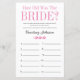Dieses schöne Brautparty-Spielblatt mit Wie alt war die Braut? vorne und Wie gut kennen Sie die Braut? hinten ist einfach und charmant - perfekt für Ihre Dusche. Diese lustigen und leichten Spiele bringen sicher viel Lachen in Ihr Brautparty! Lassen Sie sich von Familie und Freunden Bilder von der Braut aus allen Altersgruppen senden und drucken. Nummer sie und Set sie in der Nähe dieser Spielblätter. Geben Sie jedem Gast einfach ein Blatt (vergessen Sie nicht die Stifte) und ließ den Wettkampf für das erste Spiel! Sie werden erstaunt sein, wie viele Leute wirklich die Zeiten der Braut kennen. Dann dreh das Blatt und geben Sie den Gästen 5 Minuten, um die Fragen zu beantworten. Sie werden herausfinden, wer die Braut wirklich kennt. In Sekunden können Sie sehen, wie Ihr Spielblatt aussehen wird. Wählen Sie einfach diese Vorlage personalisieren und geben Sie die Namen der Braut ein.