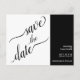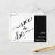 Diese Hochzeit speichert die Datums-Postkarten ein einzigartiges und elegantes 2-Scheiben-Stil mit eleganter Skriptkalligraphie auf den links und einfachen Text Details auf der rechten Seite. Die Schwarz-Weiß-Farben machen das Design sowohl einfach als auch kühl.