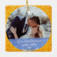 Elegant, chic "Our First Christmas as Mr. and Mrs." personalized photo Christmas ornament for newly married couples, with cursive typography / hand lettering, a frame of white and silver snowflakes and little stars, and one of sparkling (faux) bright golden glitter. Make sure you personalize the two photos, the family name (if you wish to replace Mr. and Mrs.), and the year, and on the back, your first name and that of your spouse.
