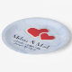 Papier Teller für eine Hochzeit oder ein Jubiläum mit einer Abbildung von zwei Papierherzen zusammengelegt - rot mit weißer Grenze. Set auf einem eleganten, eisblauen Marmorboden.