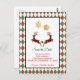 Save the Date Weihnachts-Postkarte mit Illustration von 2 Weihnachtshirschen springen. Hirsche sind kariert aus schwarzem und rotem Lumberjack, dazwischen liegt ein kleines Herz. Imitate vergoldeten Glitzer Weihnachtsdekorationen hängen von oben. Der Hintergrund ist eine rote und grüne Raute.