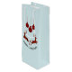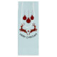 Eine Weingeschenktasche, die "Frohe Weihnachten" in gebogenem Text sagt. Entworfen mit einer Illustration von 2 Weihnachtswildspringen. Hirsche sind kariert aus schwarzem und rotem Lumberjack, dazwischen liegt ein kleines Herz. Karierte Weihnachtsdekorationen in Rot und Schwarz hängen von oben ab. Hellblauer Hintergrund.