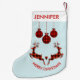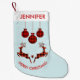 Festlicher Weihnachtsfest, personalisiert mit einem Namen, der auch "Frohe Weihnachten" in kurvigem Text sagt. Entworfen mit einer Illustration von 2 Weihnachtswildspringen. Hirsche sind kariert aus schwarzem und rotem Lumberjack, dazwischen liegt ein kleines Herz. Karierte Weihnachtsdekorationen in Rot und Schwarz hängen von oben ab. Hellblauer Hintergrund.