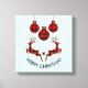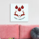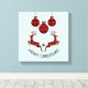 Leinwand, die "Frohe Weihnachten" in kurvigem Text ausdrückt. Entworfen mit einer Illustration von 2 Weihnachtswildspringen. Hirsche sind kariert aus schwarzem und rotem Lumberjack, dazwischen liegt ein kleines Herz. Karierte Weihnachtsdekorationen in Rot und Schwarz hängen von oben ab. Hellblauer Hintergrund.