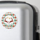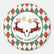 Ein Feiertagsmagnet, der "Frohe Weihnachten" in kurvigem Text sagt. Entworfen mit einer Illustration von 2 Weihnachtswildspringen. Hirsche sind kariert aus schwarzem und rotem Lumberjack, dazwischen liegt ein kleines Herz. Imitate vergoldeten Glitzer Weihnachtsdekorationen hängen von oben. Der Hintergrund ist eine rote und grüne Raute.