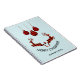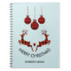 Ein personalisiertes Notizbuch, in dem "Frohe Weihnachten" in kurvigem Text steht. Entworfen mit einer Illustration von 2 Weihnachtswildspringen. Hirsche sind kariert aus schwarzem und rotem Lumberjack, dazwischen liegt ein kleines Herz. Karierte Weihnachtsdekorationen in Rot und Schwarz hängen von oben ab. Hellblauer Hintergrund.