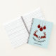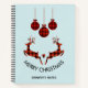 Ein personalisiertes Spiralheft, das "Frohe Weihnachten" in gebogenem Text sagt. Entworfen mit einer Illustration von 2 Weihnachtswildspringen. Hirsche sind kariert aus schwarzem und rotem Lumberjack, dazwischen liegt ein kleines Herz. Karierte Weihnachtsdekorationen in Rot und Schwarz hängen von oben ab.