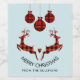 Ein personalisiertes Weinflaschenetikett, auf dem "Frohe Weihnachten" in kurvigem Text steht. Entworfen mit einer Illustration von 2 Weihnachtswildspringen. Hirsche sind kariert aus schwarzem und rotem Lumberjack, dazwischen liegt ein kleines Herz. Karierte Weihnachtsdekorationen in Rot und Schwarz hängen von oben ab.