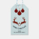 Personalisierte Geschenketiketten, die "Frohe Weihnachten" im gebogenen Text ausdrücken. Entworfen mit einer Illustration von 2 Weihnachtswildspringen. Hirsche sind kariert aus schwarzem und rotem Lumberjack, dazwischen liegt ein kleines Herz. Karierte Weihnachtsdekorationen in Rot und Schwarz hängen von oben ab. Hellblauer Hintergrund.