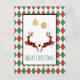 Eine Urlaubspostkarte, die "Frohe Weihnachten" auf der Vorderseite sagt und eine personalisierte Nachricht auf der Rückseite hat. Entworfen mit einer Illustration von 2 Weihnachtswildspringen. Hirsche sind kariert aus schwarzem und rotem Lumberjack, dazwischen liegt ein kleines Herz. Imitate goldene Glitzer-Weihnachtsdekorationen hängen von oben herab. Der Hintergrund ist eine rote und grüne Raute.