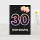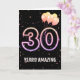 Party Ballons und Konfetti auf schwarzem Hintergrund mit der Neonnummer 30 für einen 30. Geburtstag.