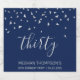 Helfen Sie ihr, ihren 30. Geburtstag stilvoll zu feiern, mit diesem schlichten, aber eleganten Design, mit Imitaten silberne dreieckige Konfetti, die sich auf dem Wort "dreißig" in silbergrauem handgeschriebenem Schriftart auf marinebasischem Hintergrund herabsetzen. Personalisieren Sie es mit dem Namen der Ehre in silbergrauen Sans Serif Schriftart, zusammen mit dem Anlass und Datum unten in kleinerem silbergrauen Typ.
