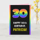 Dieses fröhliche und optimistische Geburtstagskarten-Design zeigt die Zahl "30" mit einem farbenfrohen Regenbogenspektrum inspiriert Farbverlaufsmuster, zusammen mit der Meldung "HAPPY 30 th BIRTHDAY" und einem anpassbaren Empfängernamen. Im Inneren befindet sich eine individuell angepasste Geburtstagsgrüßbotschaft, oder man könnte sie löschen und leer verlassen werden, wenn eine Nachricht von Hand geschrieben werden soll. Eine lustige, bearbeitbare Geburtstagskarte wie diese kann zum Feiern des dreißigsten Geburtstags verschickt werden. [~Z0000636]