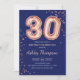 Party Einladung zum 30. Elegantes Design in Imitate Glitzer Rose Gold und Marineblau. Einladende Karte mit Rose Gold Nummer 30 Ballons und Skript-Schriftart. Ideal für eine stilvolle Feier. Nachricht, wenn du ein Alter brauchst.