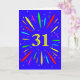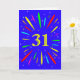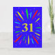Eine explosive 31. Geburtstagskarte! Was für eine wunderbare Art, Geburtstagsgrüße zu schicken. Die Zahl 31 in hellgelb mit einer Explosion von hellen Farben und Sternen.