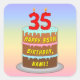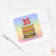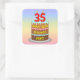 This colorful and joyful birthday themed square sticker design features a cartoon-style depiction of a three-tier birthday cake having number-shaped candles on top showing the age “35“, along with the message “HAPPY 35TH BIRTHDAY,”, and a customizable recipient name. The background has a multi-color pastel rainbow spectrum inspired gradient pattern. Fun birthday themed stickers like these might be used or given out at a birthday party in celebration of somebody’s thirty fifth birthday, or perhaps used when wrapping gifts/presents or preparing invitations for such an event. [~Z0000624]