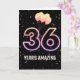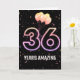 Party Ballons und Konfetti auf schwarzem Hintergrund mit dem Neon Nummer 36 für einen 36. Geburtstag.