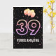 Party Ballons und Konfetti auf schwarzem Hintergrund mit dem Neon Nummer 39 für einen 39. Geburtstag.