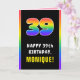 Dieses fröhliche und lebendige Geburtstagsthema Grußkartendesign weist eine große Zahl "39" mit einem vielfarbigen Regenbogenspektrum inspiriert Farbverlaufsmuster auf, zusammen mit der Meldung "HAPPY 39th BIRTHDAY" und einem bearbeitbaren Empfängernamen. Die Innenseite hat eine individuelle Geburtstagsgrüßnachricht, oder könnte gelöscht und leer verlassen werden, wenn eine Nachricht von Hand geschrieben werden soll. Eine positive, anpassbare Geburtstagskarte wie diese könnte eine lustige Art sein, jemandem, der seinen neununddreißigsten Geburtstag feiert, einen Geburtstag zu schenken. [~Z0000636]