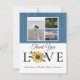 Chic Sunflower Liebe Elegant Yellow and Dusty Blue Wood - White Script Wedding Foto Collage Danke You Card mit einem Rahmen über eine Collage von 3 Ihrer Fotos.