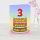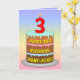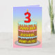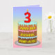 Dieses fröhliche und farbenfrohe Geburtstagskarten-Design zeigt eine Cartoon-Darstellung eines dreistufigen Geburtstagskuchens mit einer numeralförmigen Kerze oben, die die Zahl "3" zeigt, sowie die Meldung "HAPPY 3RD BIRTHDAY" und einen benutzerdefinierbaren Empfängernamen. Der Hintergrund der Vorderseite hat ein mehrfarbiges, pastellfarbenes Regenbogenspektrum, inspiriert Farbverlauf. Im Inneren befindet sich eine benutzerdefinierte Geburtstagsgrüßbotschaft, oder man könnte sie löschen und leer verlassen werden, wenn eine Nachricht von Hand geschrieben werden soll. Eine lustige, personalisierte Geburtstagskarte wie diese könnte eine lustige Art sein, jemandem, der seinen dritten Geburtstag feiert, Geburtstagswünsche zu schicken. [~Z0000625]