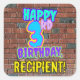 Dieses lustige Geburtstagsdesign mit quadratischem Aufkleber zeigt die Meldung "HAPPY 3RD BIRTHDAY" mit einem lebendigen, bunten, urbanen Straßenkunst und Graffiti-inspirierten Aussehen, zusammen mit einem individuellen Empfängernamen. Der Hintergrund weist ein Muster auf, das durch das Aussehen einer Ziegelwand inspiriert wird. Personalisierte Aufkleber wie diese können als Geburtstagsgeschenk oder als Verpackung von Geschenken verwendet werden oder als Geburtstagsgeschenk bei Jemandem zum 3. Geburtstag verwendet werden. [~Z0000535]