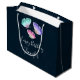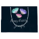 Eine personalisierte Geburtstagsgeschenktasche (groß) mit hübschem Design. 3 Schmetterlinge in Aquarellfarbe, rosa, lila und grün gestrichen. Dunkelblauer Aquarellhintergrund.