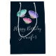 Eine personalisierte Geburtstagsgeschenktasche mit hübschem Design. 3 Schmetterlinge in Aquarellfarbe, rosa, lila und grün gestrichen. Dunkelblauer Aquarellhintergrund.